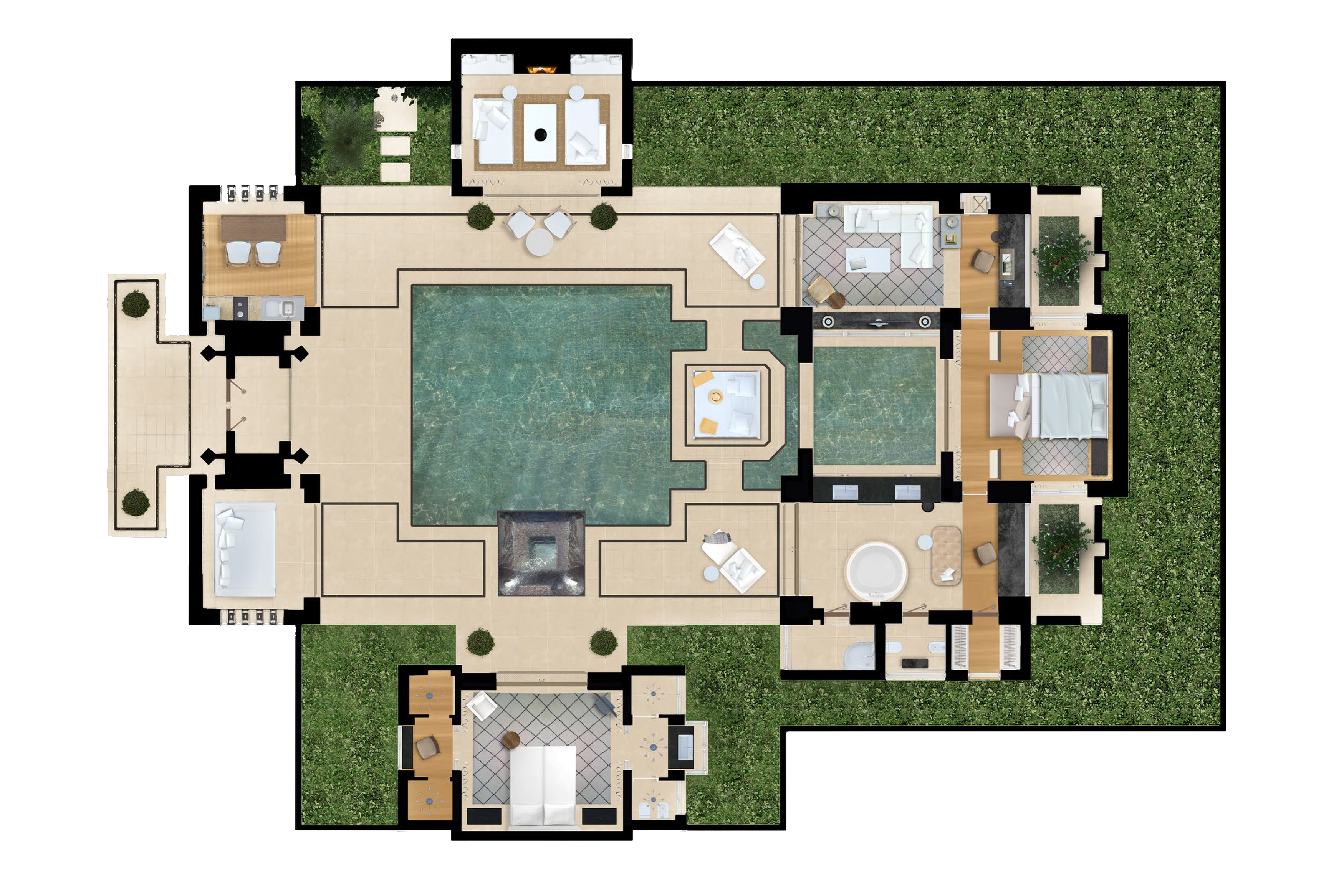 يدخل الضيوف هذه الأجنحة الرائعة عبر أبواب خشبية ثقيلة، ويُرحَّب بهم في الفناء المركزي الذي يحتوي على مسبح، وحوض مياه ساخنة، وموقد مفتوح، ومساحة للجلوس وتناول الطعام، ومساحات لحمامات الشمس. وتفتح الأبواب الزجاجية الخاصة بغرفة النوم الرئيسية مباشرة على الجاكوزي. وفي إحدى الجهتين، هناك مساحة معيشة مع مكتب للعمل وأريكة، وفي الجهة الأخرى، حمام كبير يغمره النور ويحتوي على حوض استحمام دائري وحمام بخار وغرفة ملابس.