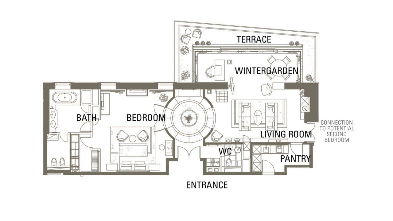 Interiors offer a sophisticated and modern fusion of old and new with polished chrome walls lined with original prints by artist Felix Rehfeld and a relief crafted by Nymphenburg, the esteemed Royal Bavarian porcelain manufacturer. The Bulthaup kitchen serves a glass-enclosed dining area, which is the perfect spot for intimate dinners. The bathroom is a luxurious space for rejuvenation with a large bath, walk-in shower, hot tub and adjoining steam room. This suite is furnished with a 2m x 2m King bed.