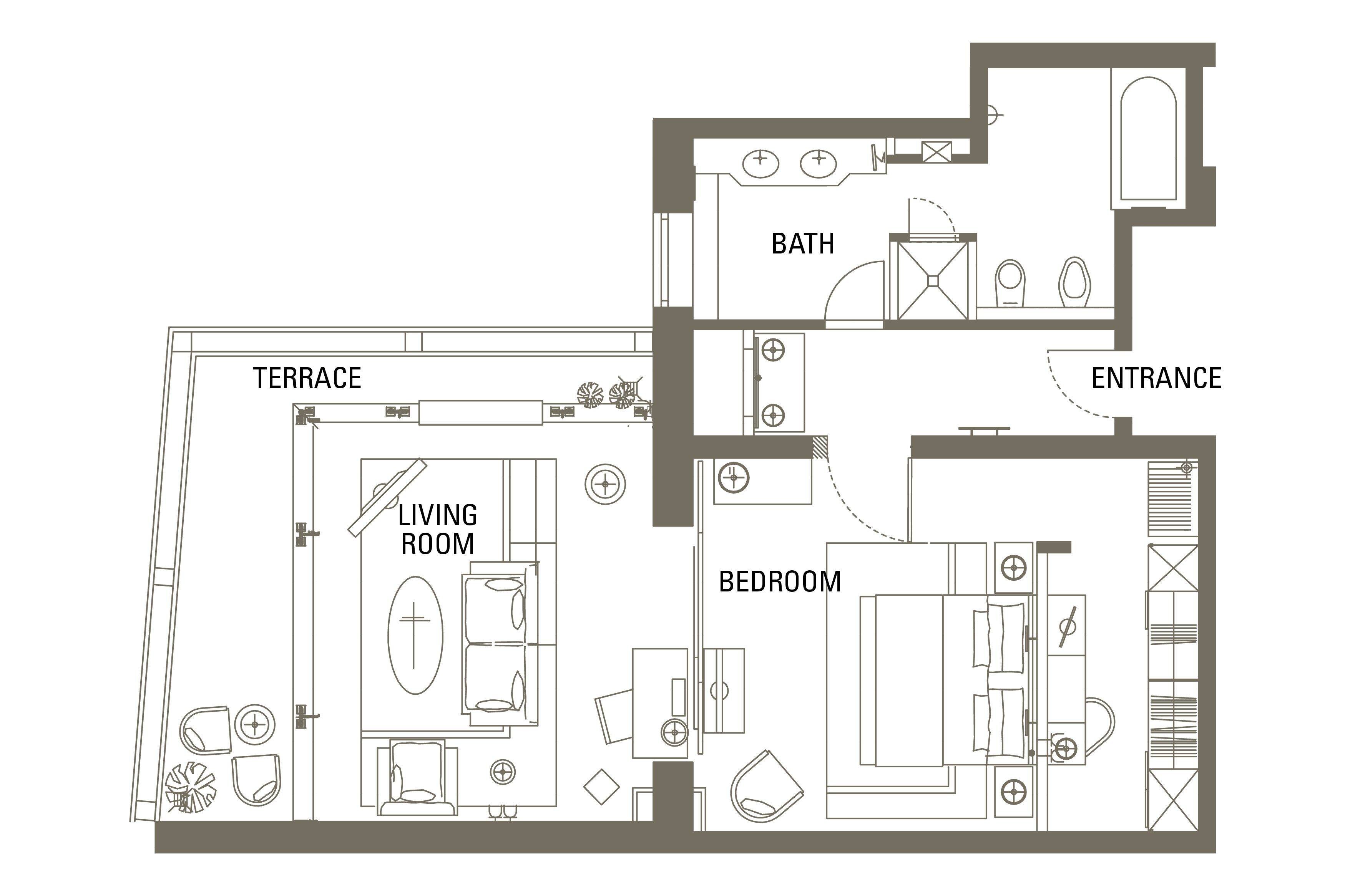 Located on the sixth floor, this one-bedroom suite features a master bedroom and adjoining living room. Stretching the width of the glass-enclosed living room, a wraparound balcony offers dining and wonderful views.