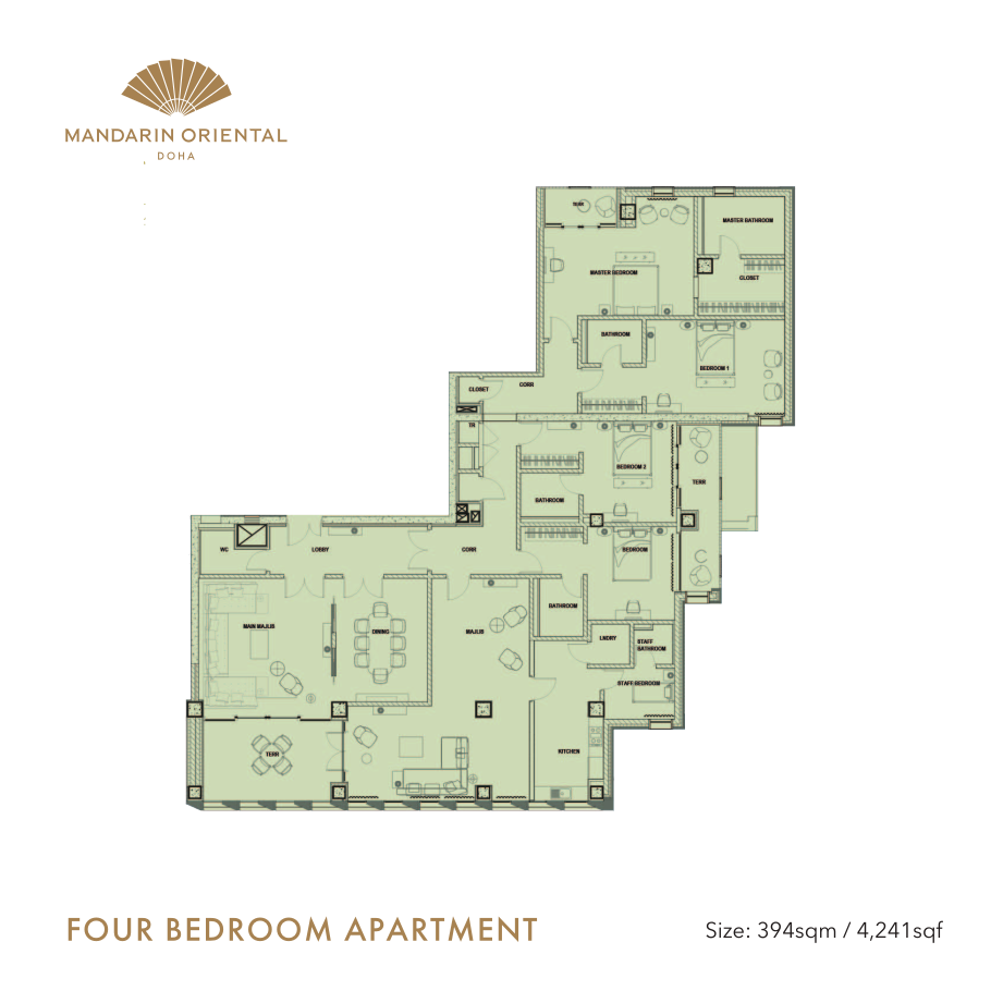 The generous living space is designed with ultimate comfort in mind and overlooks a brightly lit private balcony. In addition to the four bedrooms, this fully furnished apartment holds a living room, family room (Majlis) and a dining room. The fully fitted kitchen has a laundry room, whilst a corridor leads to the four furnished bedrooms. One of the bedrooms has double single beds, and the master bedroom includes a wardrobe space and a dressing area. The spacious en-suite bathrooms each contain two basins, a bathtub and a walk-in rain shower.