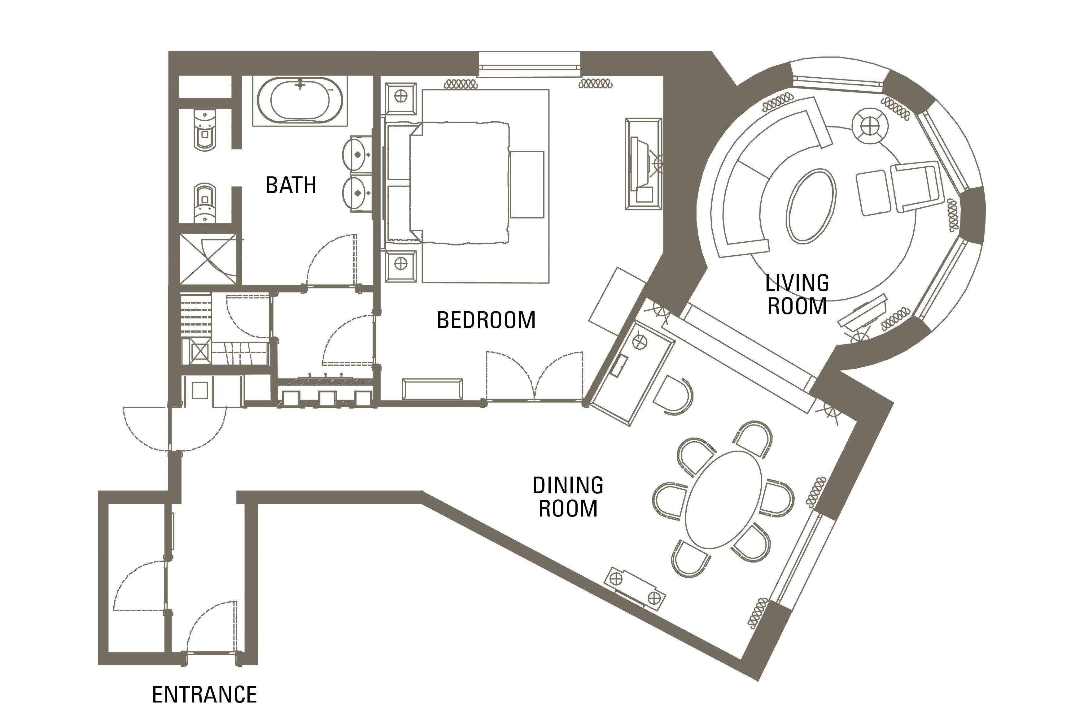 This elegant suite features a circular sitting room on a raised platform with curved windows and six-metre silk curtains. Adjacent to this lies a dining room for six, a bedroom with walk-in wardrobe and a spacious bathroom.