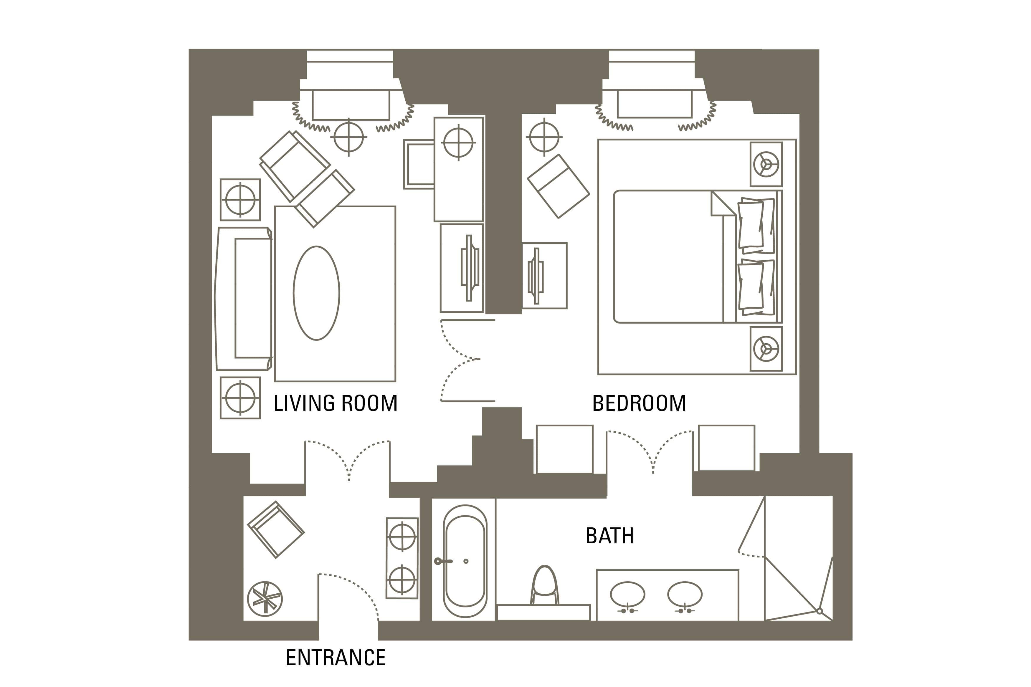 This luxurious suite exudes Czech history. A high-ceilinged, sunlit living room leads into a grand corner bedroom. The large stone-clad bathroom is flooded with natural light, adding to the overall sense of space and grandeur.