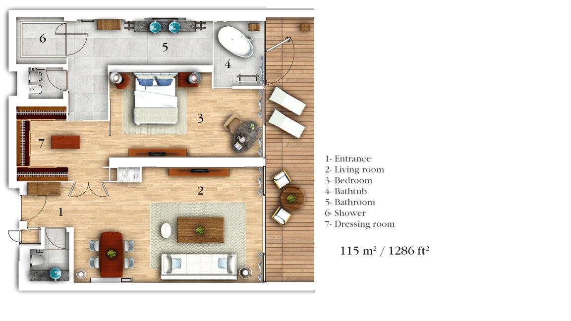 Offering peaceful views over Paradise Bay, this exceptional suite features a large bedroom with king bed. The suite also includes a large master bathroom with a steam shower and a bath, a living room and a fantastic 35sqm balcony.