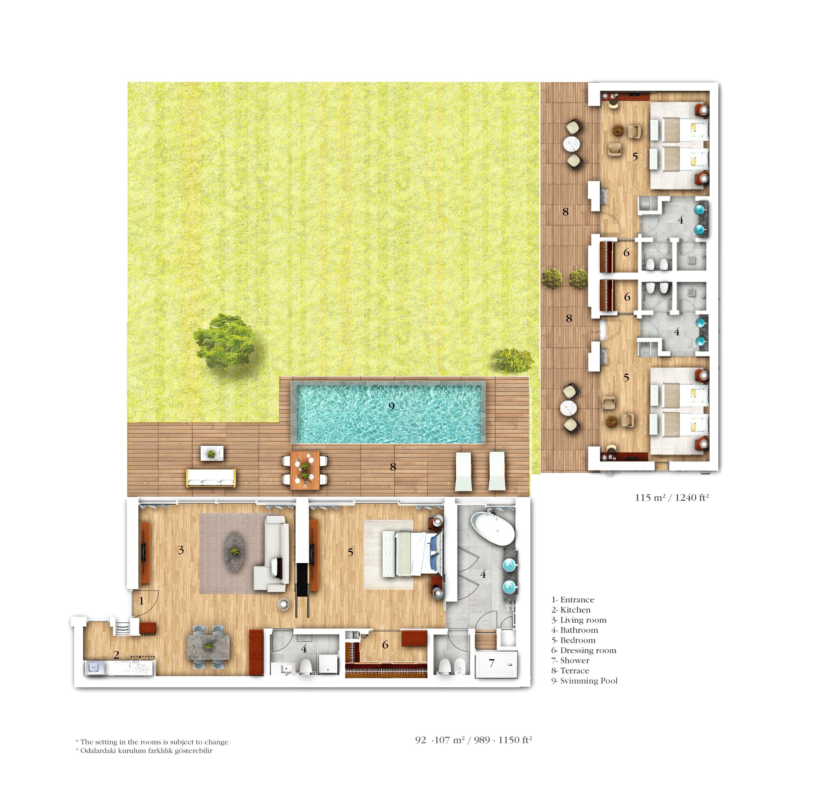 This luxurious one storey villa features three bedrooms with en-suite bathroom. Furnished with a range of seating areas, the separate living room opens up to a terrace with its own private pool.