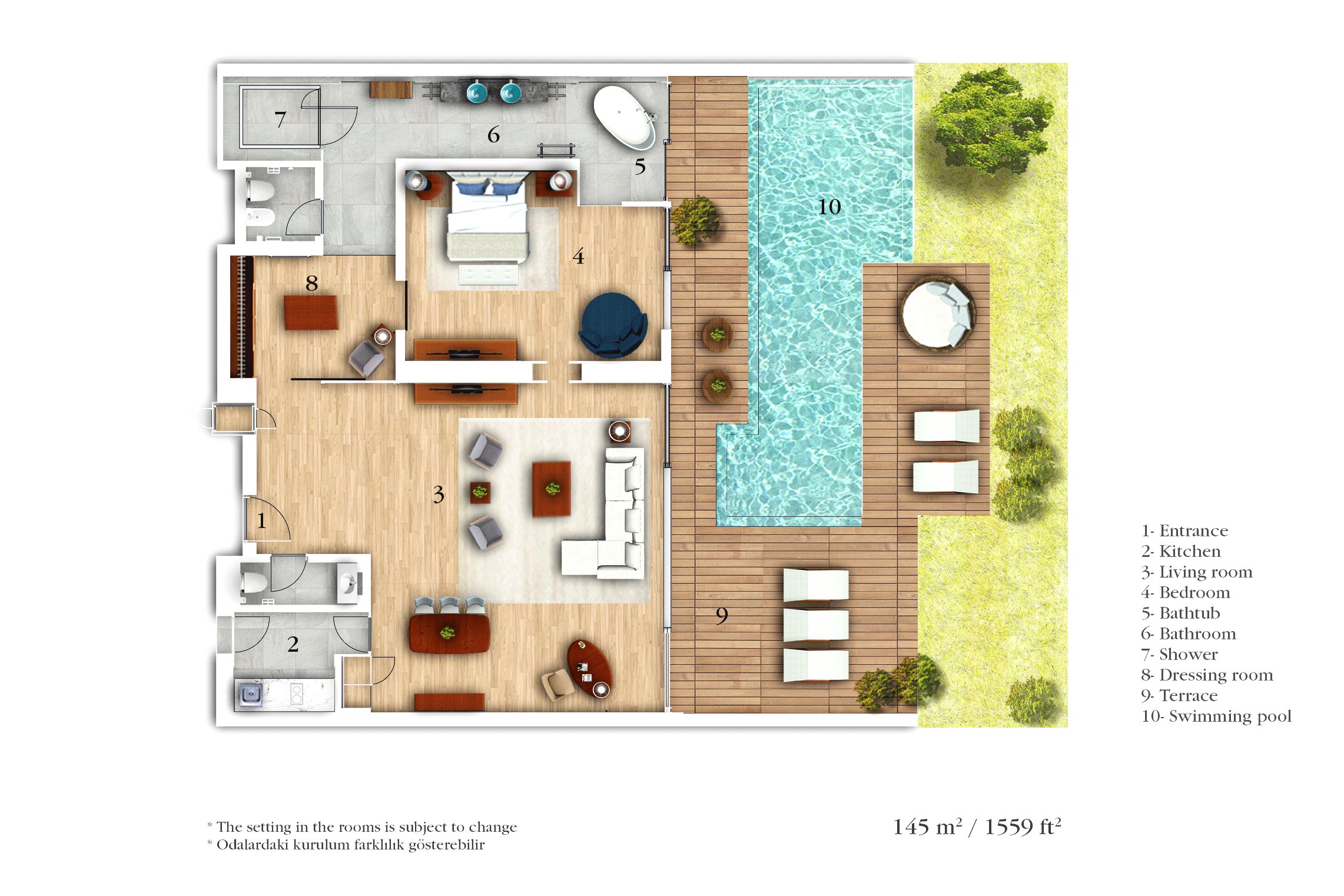 Bathrooms have an oversized bathtub and steam shower. Inside, soft grey rugs, wooden floors and dark wood furnishings help create a feel of quiet luxury enhanced by the thoughtfully designed layout and relaxed mood lighting. Providing ample space, these villas feature a master bedroom with a king bed, living area and powder room.
