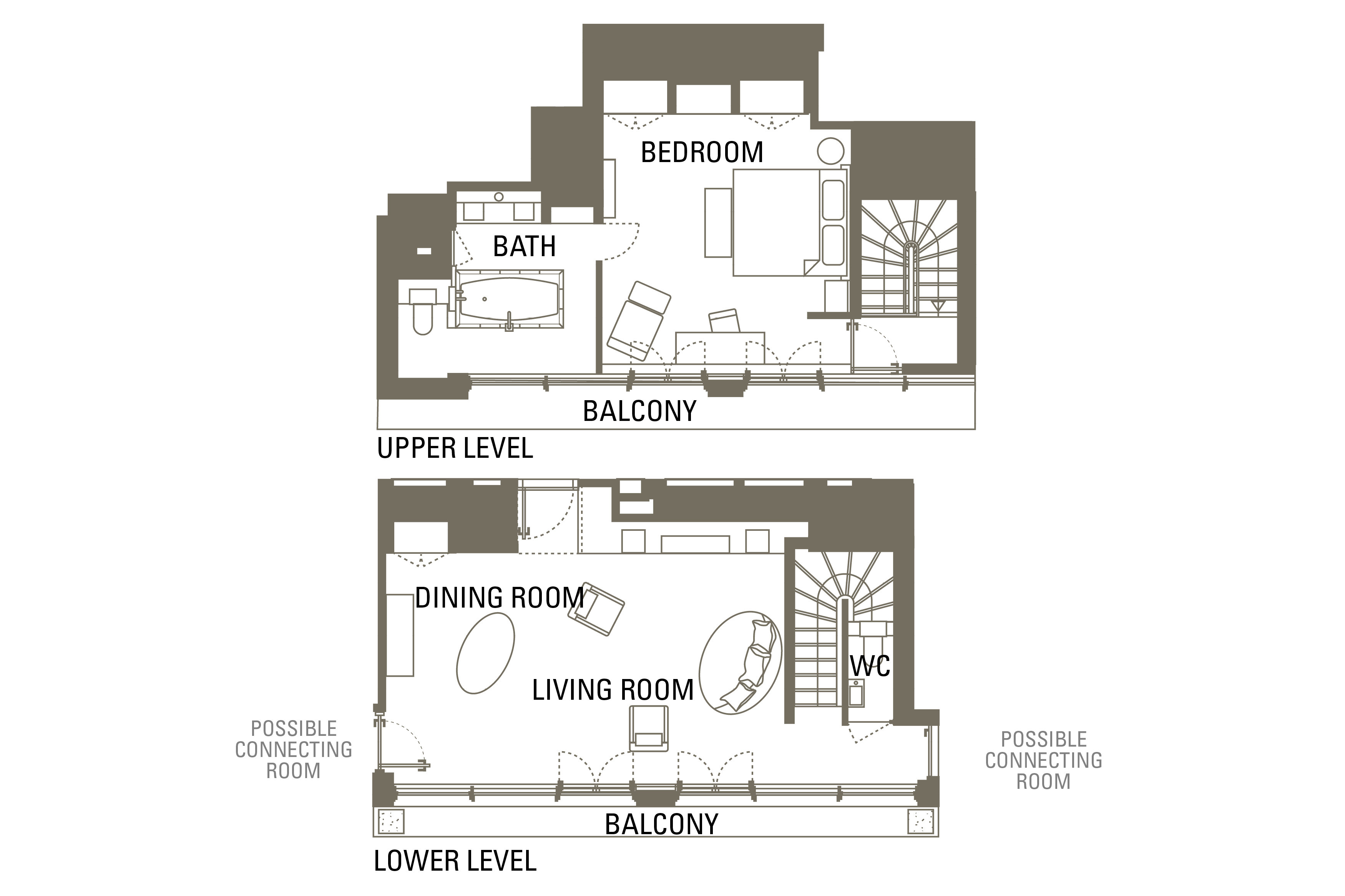 Spread over one or two floors, depending on layout, these elegant suites consist of a living and dining area, a spacious bedroom with king or twin beds, dressing area and bathroom. All suites have a private terrace or balcony.