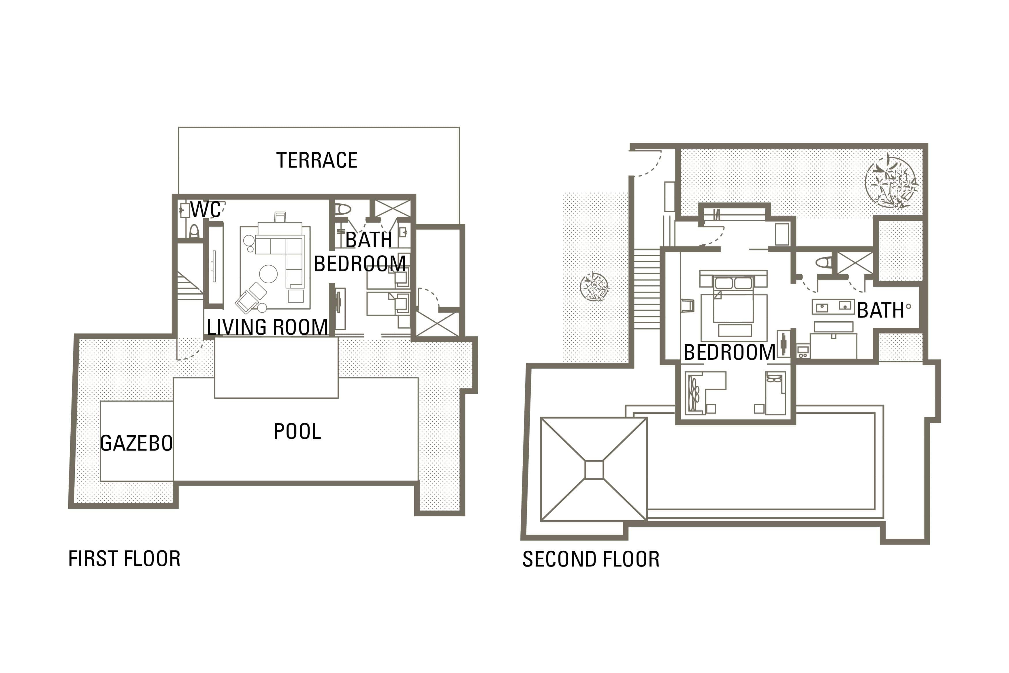 The ground floor features a twin bedroom, living room and access to a private garden with infinity pool and dining area. Upstairs, the master bedroom leads into a vast bathroom with oversized jetted bath and rainforest shower.