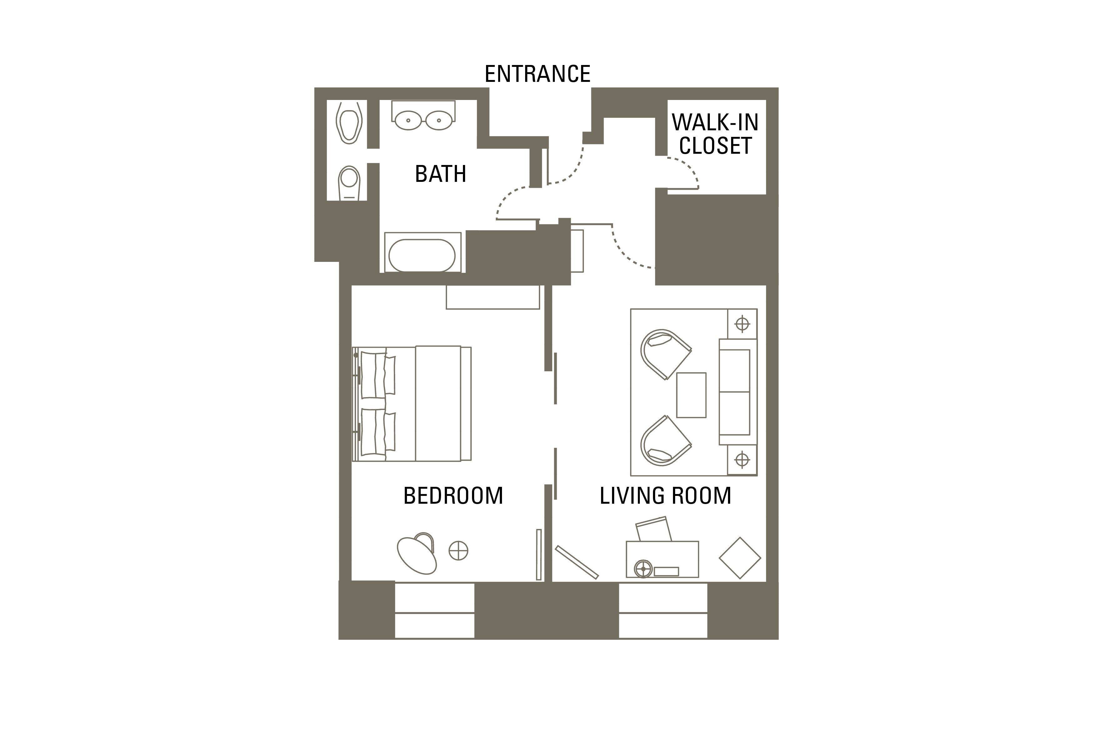 Гостиная примыкает к спальне и дарит ощущение еще большего пространства. Из элегантной ванной комнаты, которая оборудована душевой кабиной и ванной, открывается доступ к просторному встроенному шкафу.