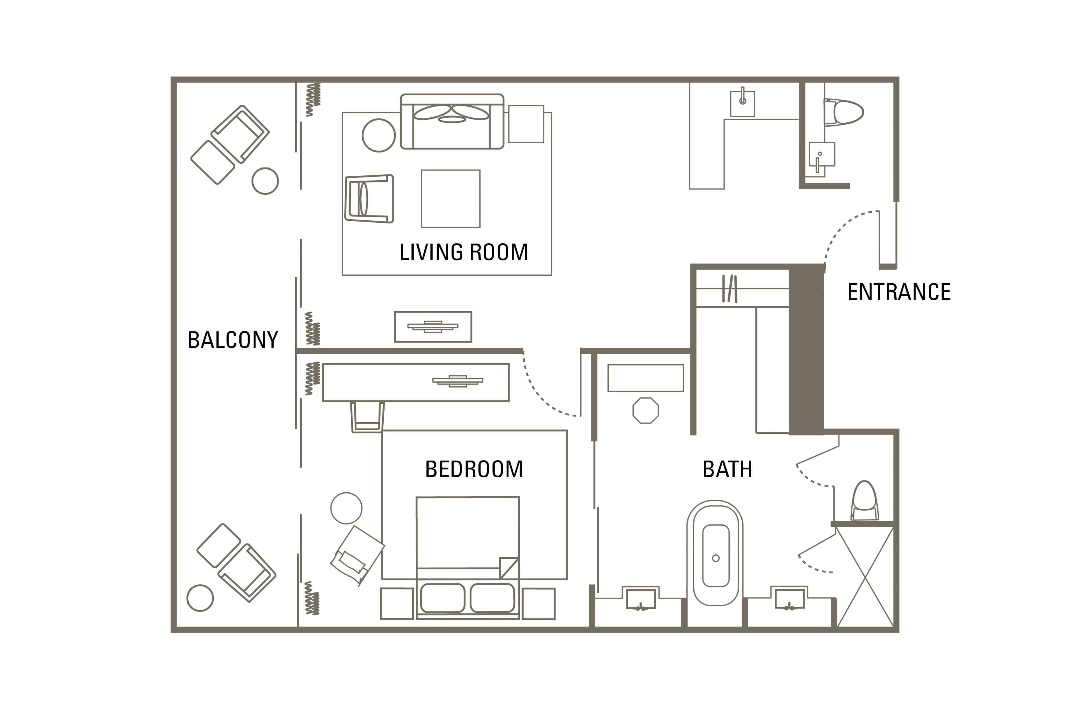 从宽敞套房内,可以眺望南中国海的壮美景致。卧室和起居室设计雅致,皆可通往与套房等宽的大露台。浴室配有超大浴缸和雨林淋浴间。